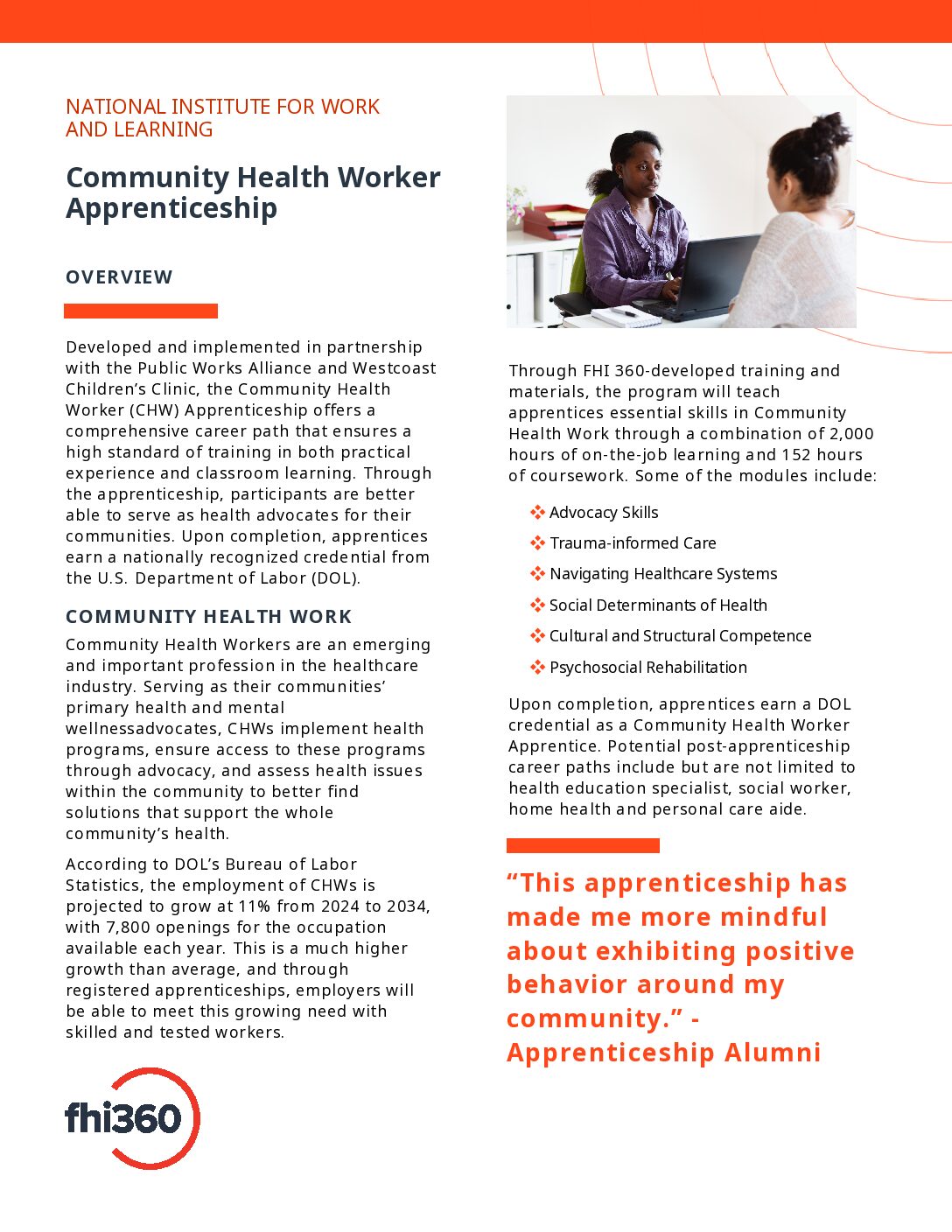 Developed and implemented in partnership with the Public Works Alliance and Westcoast Children’s Clinic, the Community Health Worker (CHW) Apprenticeship offers a comprehensive career path that ensures a high standard of training in both practical experience and classroom learning. Through the apprenticeship, participants are better able to serve as health advocates for their communities.