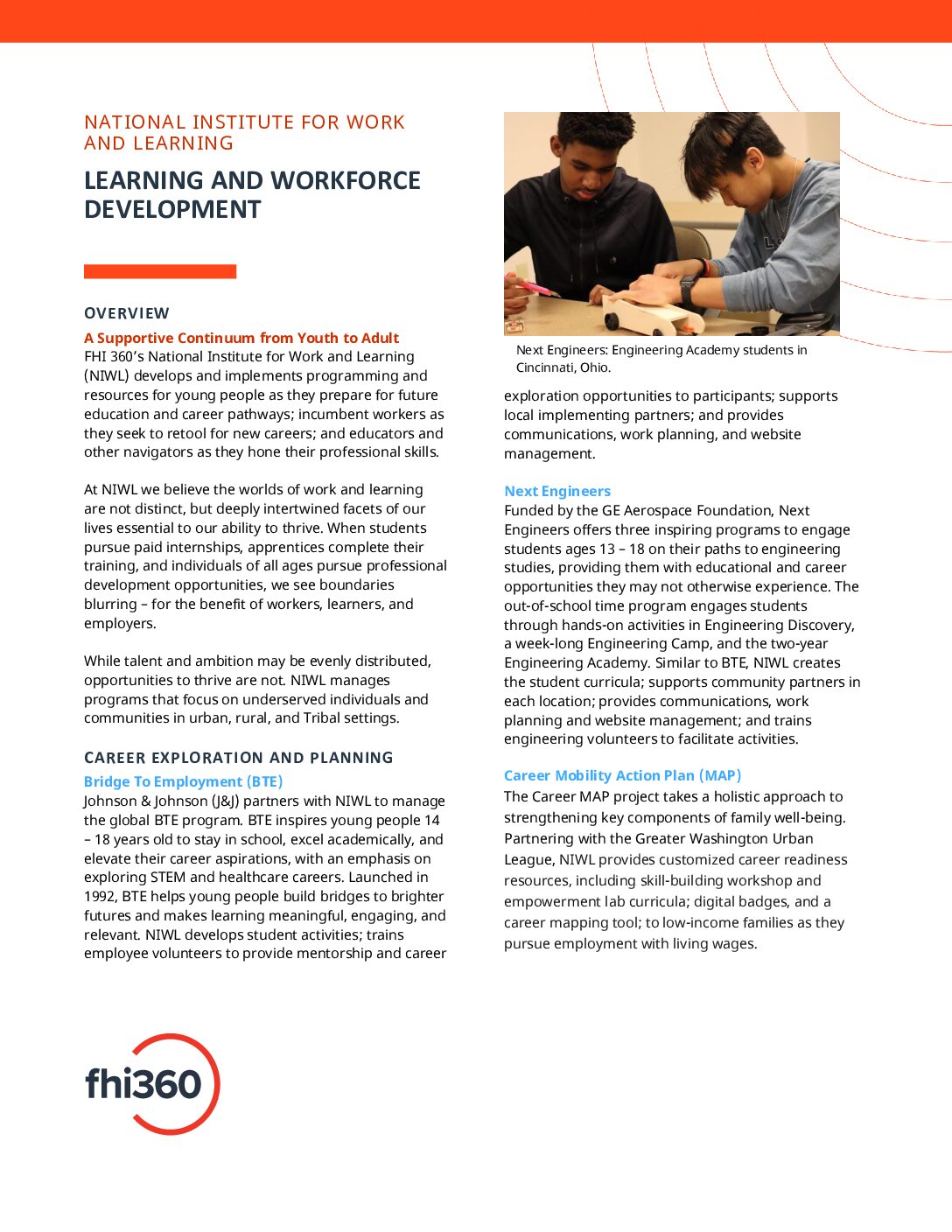 NIWL’s programs serve youth and young adults in career exploration, workforce development, and education to career transitions – all to serve the greater workforce environment in a way that benefits workers, learners, and employers. Read the full overview to learn more.
